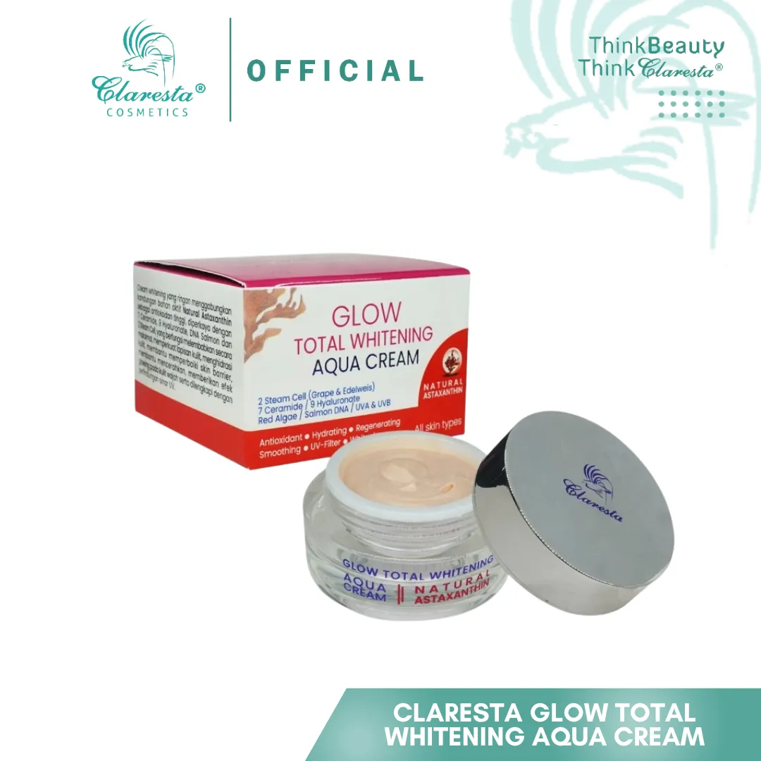 Untuk perawatan wajah yang lebih maksimal, Glow Total Whitening Aqua Cream hadir dengan formula pencerah sekaligus pelembap. Kandungan Astaxanthin di dalamnya membantu melindungi kulit dari kerusakan akibat paparan sinar matahari dan polusi, sementara teksturnya yang creamy namun ringan membuat kulit terasa lembut dan segar sepanjang hari. Krim ini cocok digunakan pagi maupun malam, membuat wajah tampak cerah merata dan glowing alami.
